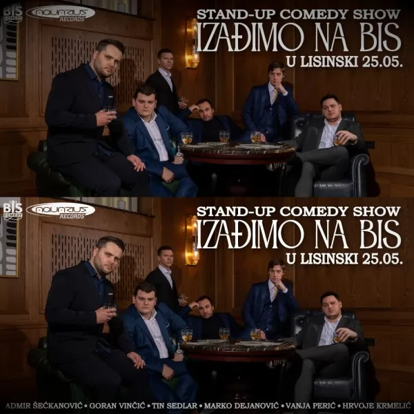 U subotu, 25. svibnja 2024., u velikoj dvorani Vatroslav Lisinski nastupit će šest izuzetnih komičara koji su dio BIS comedy kolektiva, a radi se o sljedećim legendama: Marko Dejanović, Tin Sedlar, Goran Vinčić, Hrvoje Krmelić, Admir Šećkanović i Vanja Perić.